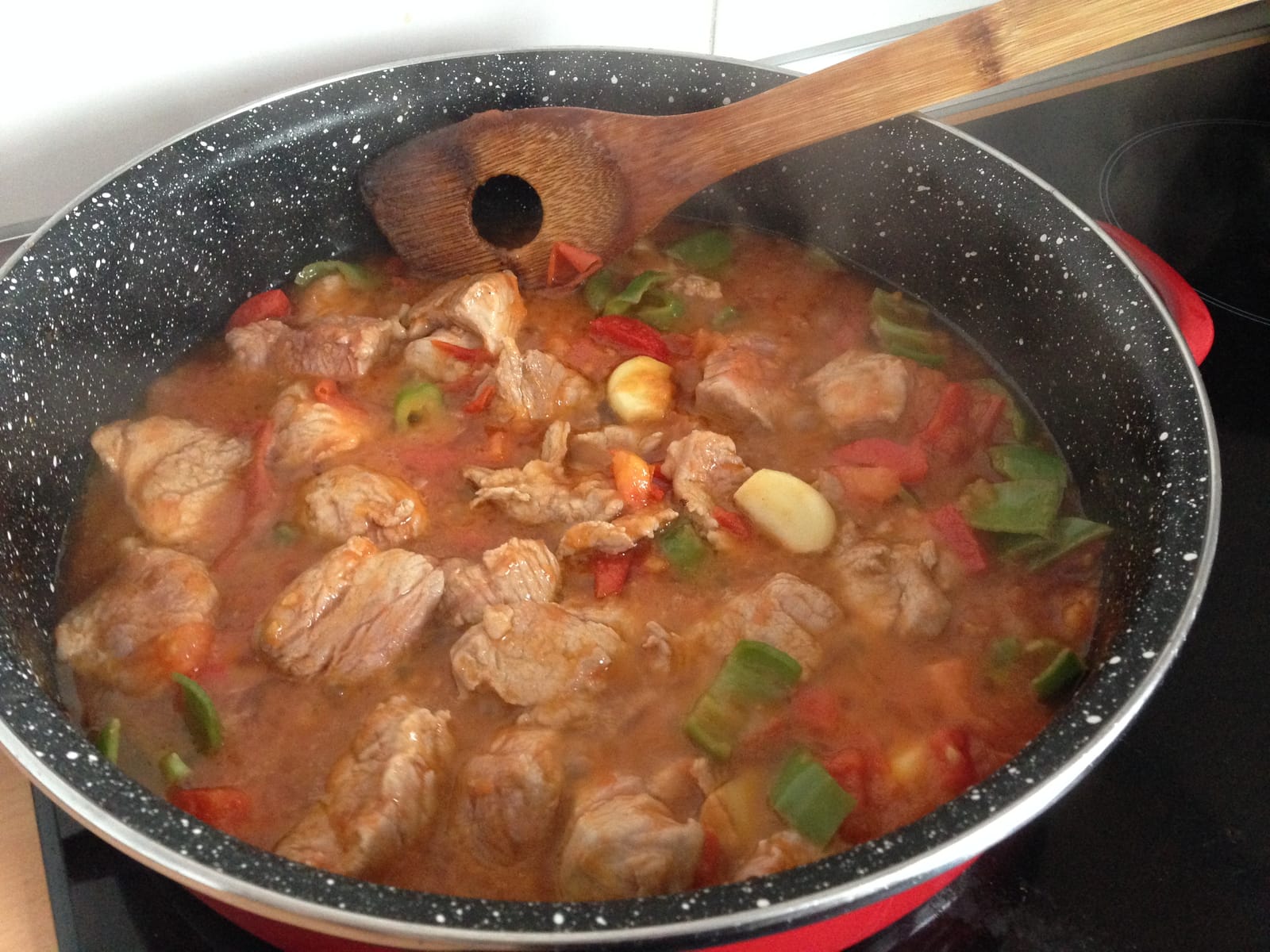 En un perol ponemos a pochar los ajos y a continuacion le añadimos los tomates,pimientos y pimenton, cuando este frito le añadimos la carne